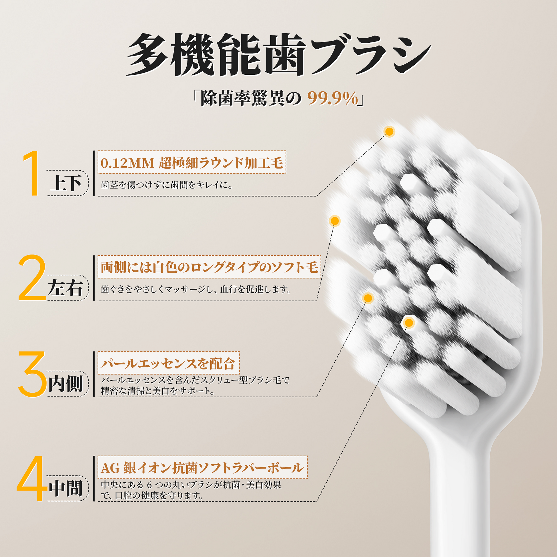 - この歯ブラシは 4 倍の洗浄力を誇り、スムーズに歯間や歯ぐきの溝に入り込み、コーヒーや紅茶のしみなどの着色汚れを除去します。スパイラル毛とパールエッセンスを配合したソフトラバー柱が相乗効果を発揮し、歯のしみを分解すると同時にエナメル質を保護します。